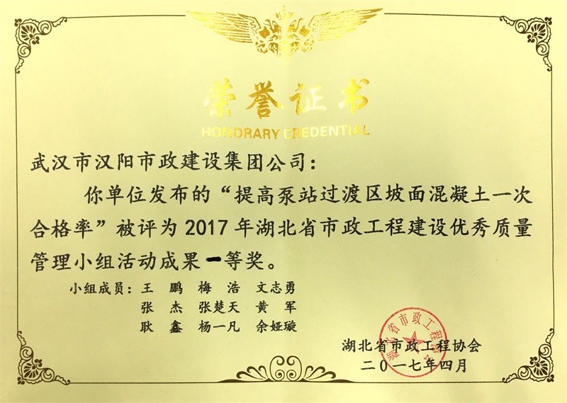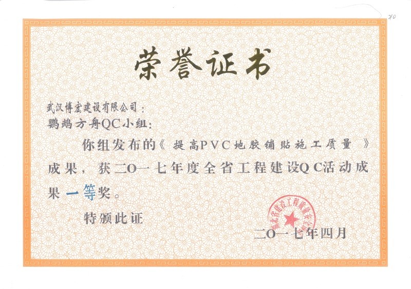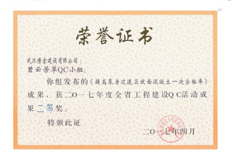 2017年武漢市地區(qū)建筑QC活動(dòng)成果優(yōu)秀獎(jiǎng)(博宏先鋒小組)