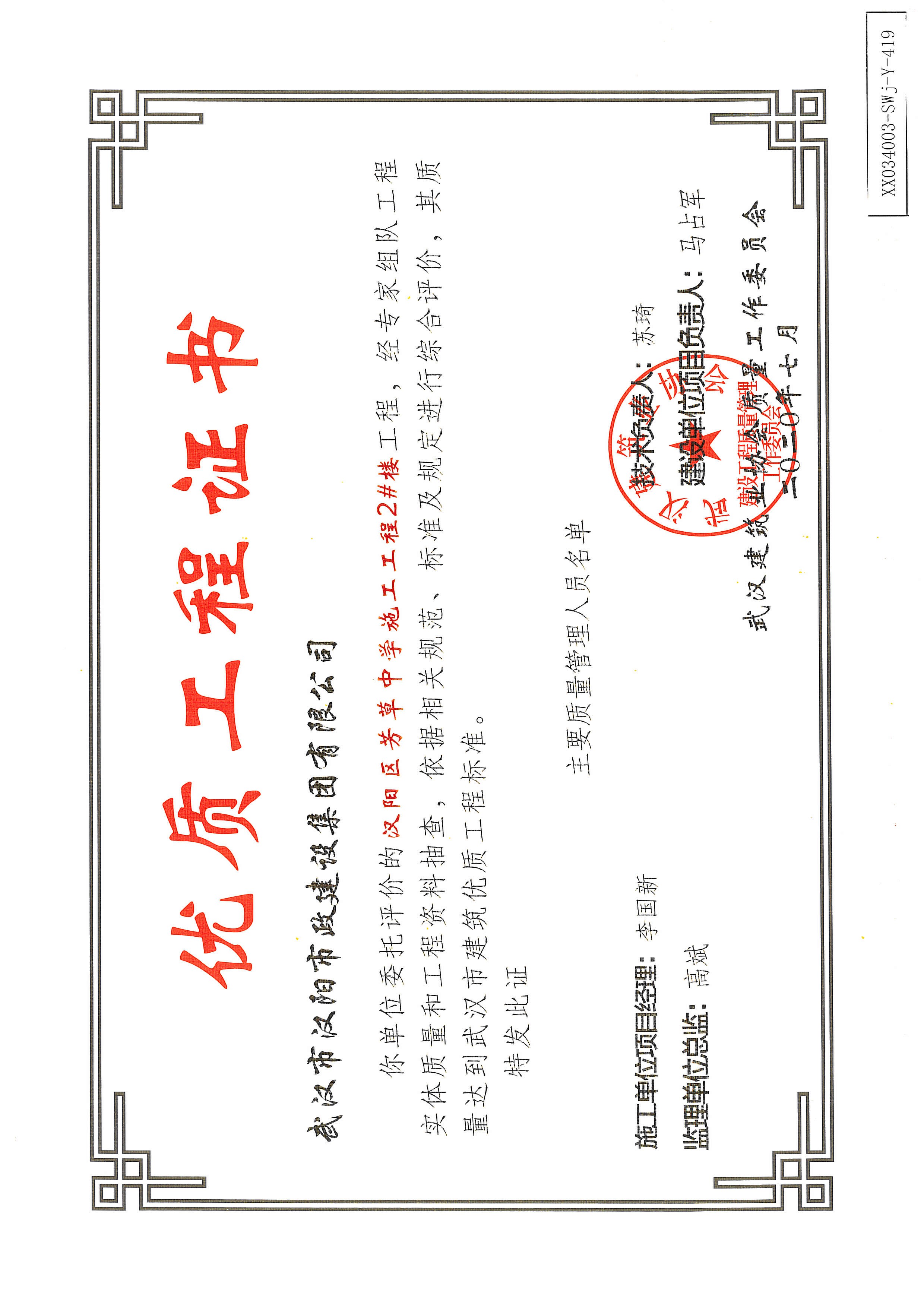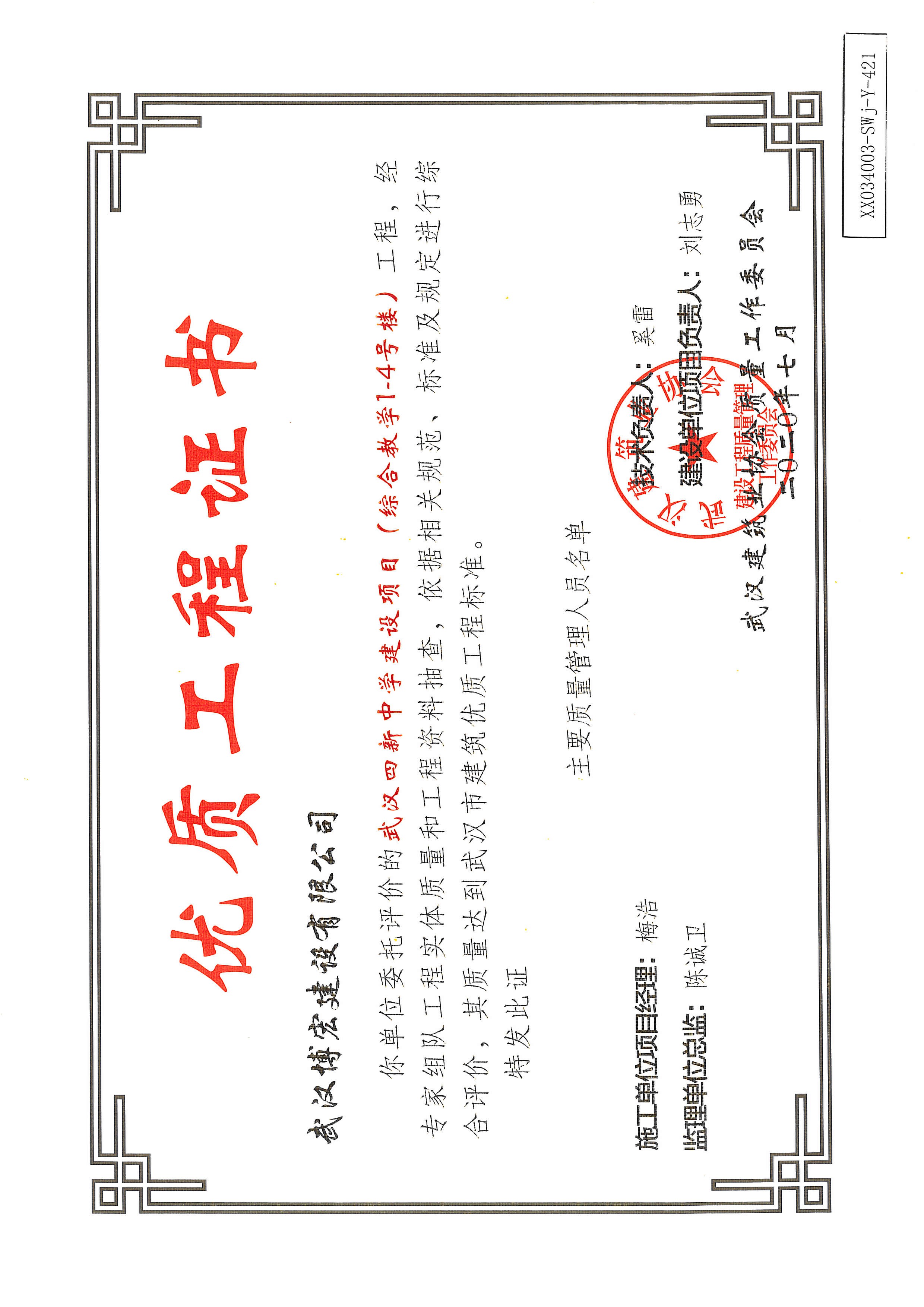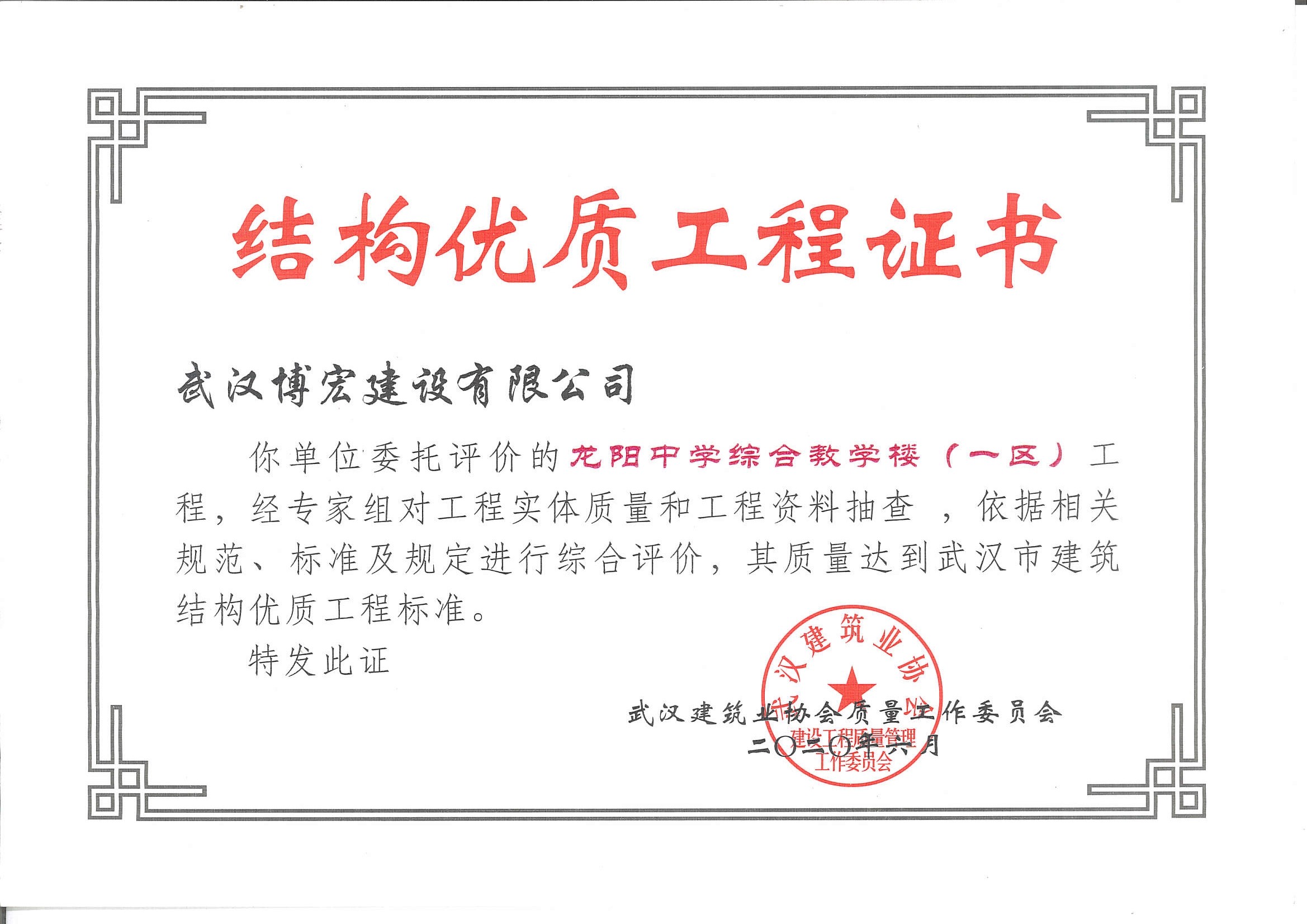 優(yōu)質(zhì)工程證書(武漢四新中學(xué)建設(shè)項(xiàng)目工程(綜合教學(xué)1--4號(hào)樓)