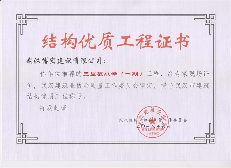 結(jié)構(gòu)優(yōu)質(zhì)工程證書(三里坡小學(xué)一期)