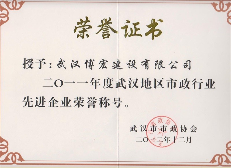 2011年度武漢地區(qū)市政行業(yè)先進(jìn)企業(yè)榮譽(yù)稱號