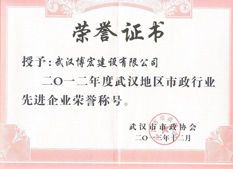 2012年度武漢地區(qū)市政行業(yè)先進(jìn)企業(yè)榮譽(yù)稱號