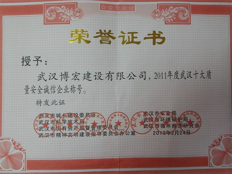 2011年度武漢十大質(zhì)量安全誠信企業(yè)稱號