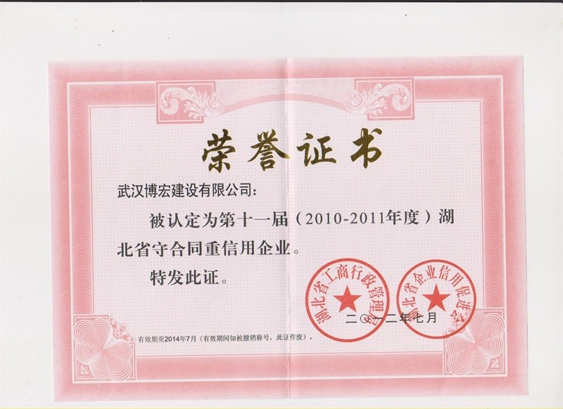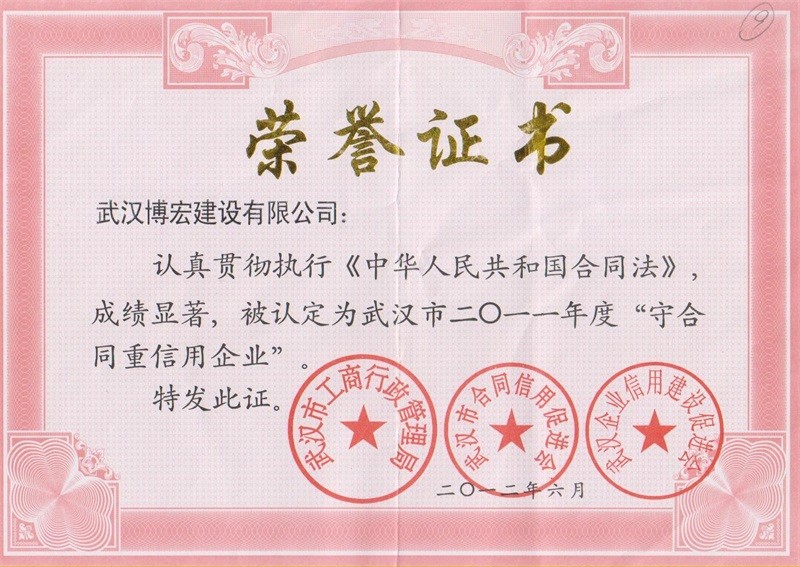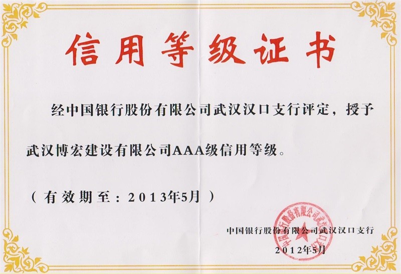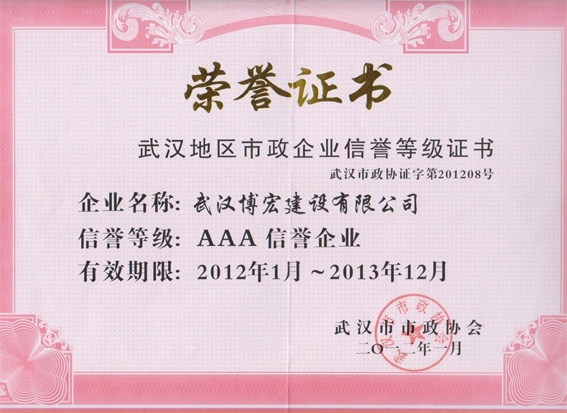 2012-2013年度武漢地區(qū)市政行業(yè)企業(yè)信譽(yù)等級(jí)證書(shū)