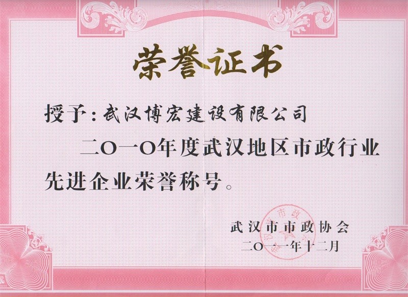 2010年度武漢地區(qū)市政行業(yè)先進(jìn)企業(yè)榮譽(yù)稱(chēng)號(hào)