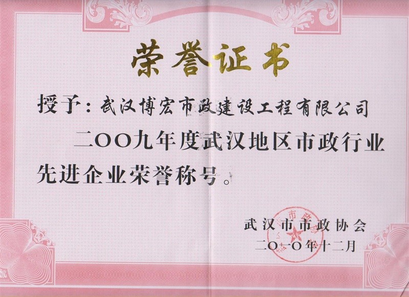 2009年度武漢地區(qū)市政行業(yè)先進(jìn)企業(yè)榮譽(yù)稱號