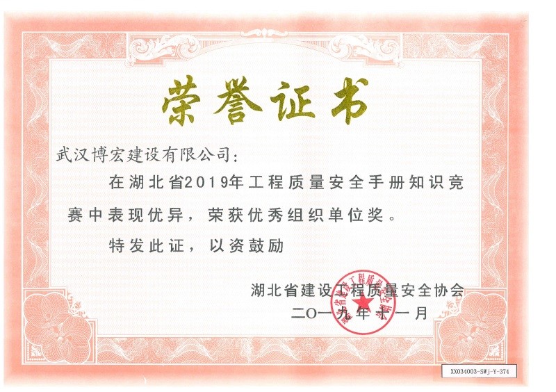 湖北省2019年工程質(zhì)量安全手冊競賽優(yōu)秀組織單位獎